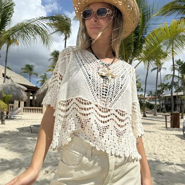 Canwedance Boho Hollow Out Tops Knitted Cotton Crochet T Shirts Round Neck Solid Color Beach Blusas Femme White Crop Tops